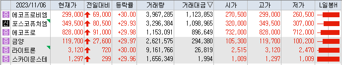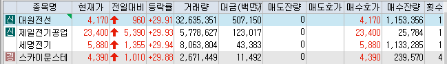 스카이문스테크놀러지는 생략.안그래도 지속적으로 신고가를 뽑아내고 있는 전력 테마인데,, 금일은 심지어 상한가도 세종목이나 뽑아냈다,,전력 테마주들의 상승 원인은 뭐 간략하게 말하자면 인공지능 시장 즉 AI시장 산업이 커짐에 따라 자연스레 데이터 센터에 사용되는 전력의 양이 증가하게 될 것이며 그로 인해 수요가 급증할것이라는 이유. 뭐 추가적으로는 구리가격의 급등과 미 정부의 신재생에너지 관련 발언 정도,,? 무튼, AI 시장 산업의 성장이 전력 테마주들 급등의 주 원인이고,, 지금 시장에서 얼마나 강력한지는 아래 스샷을 보면 대략 감이 잡힐듯,,전력설비 관련 종목들 27개중 26종목이 상승,, 아래는 전력설비 관련 종목들 중 대금 순으로 나열한 것이고,,상한가가 3종목 나왔으며 여기서 오늘 5종목을 매매..